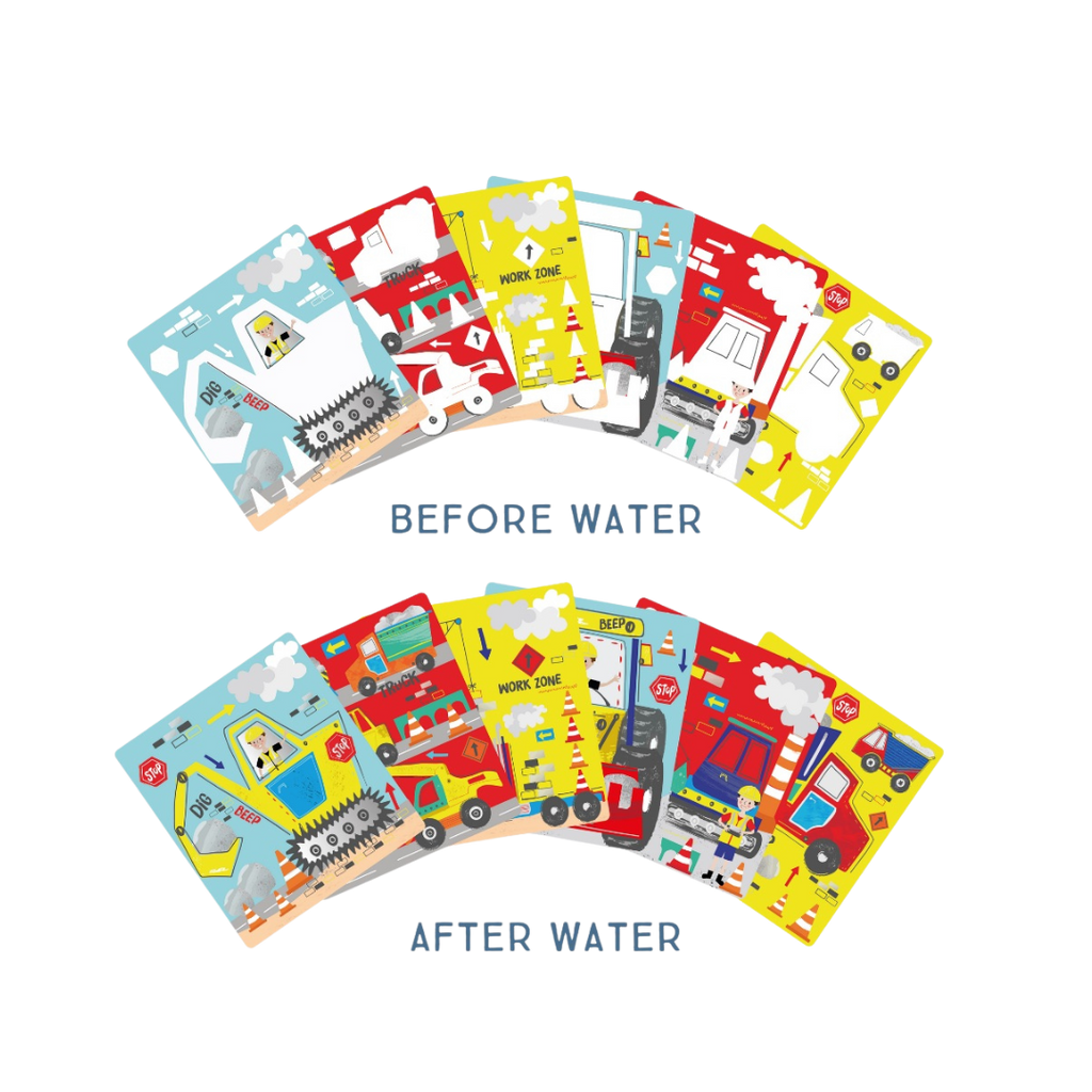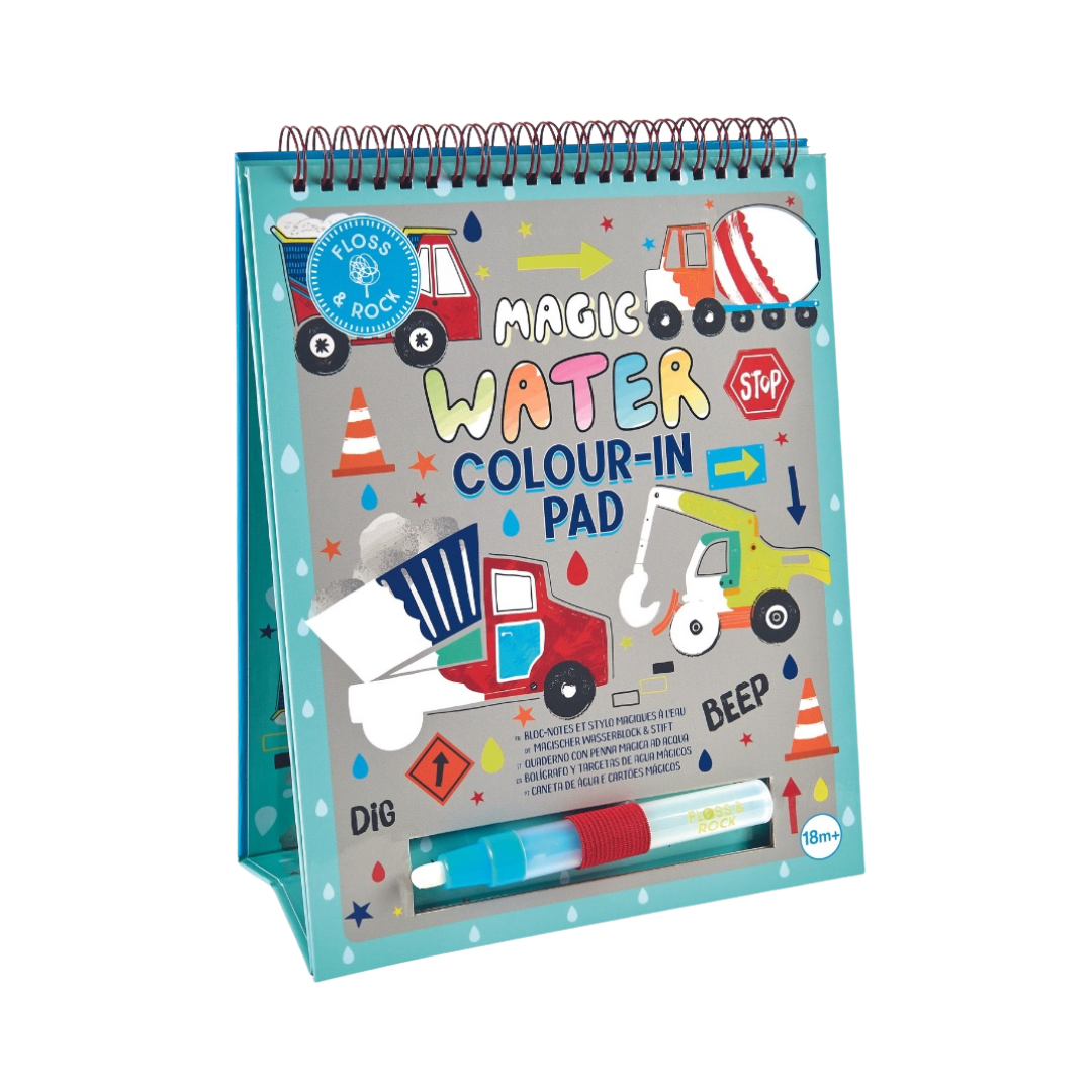 Our Magic Water Easel Pads are so much fun! Like our popular water cards, fill up the pen with water and colour in the designs to see them magically appear, then disappear once dry. The 6 brightly coloured fun sheets are held together in a spiral bound pad allowing you to flip them over once complete. The built-in easel stands the pad up so you can use it like a ‘proper’ artist! The pad is reusable over and over again and you’ll have so much fun revealing the colourful diggers, trucks, builders and more! Once you’ve finished your creative session, close the pad and secure your special water pen in the elastic closure to keep it nice and safe. This portable pad is perfect for taking out and about (and you don’t have to worry about any mess either!)