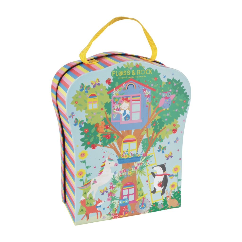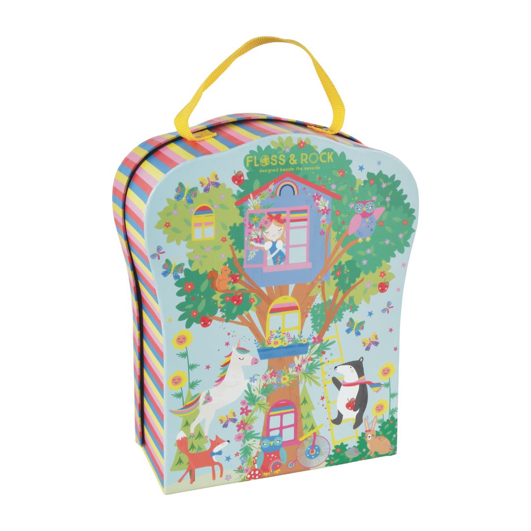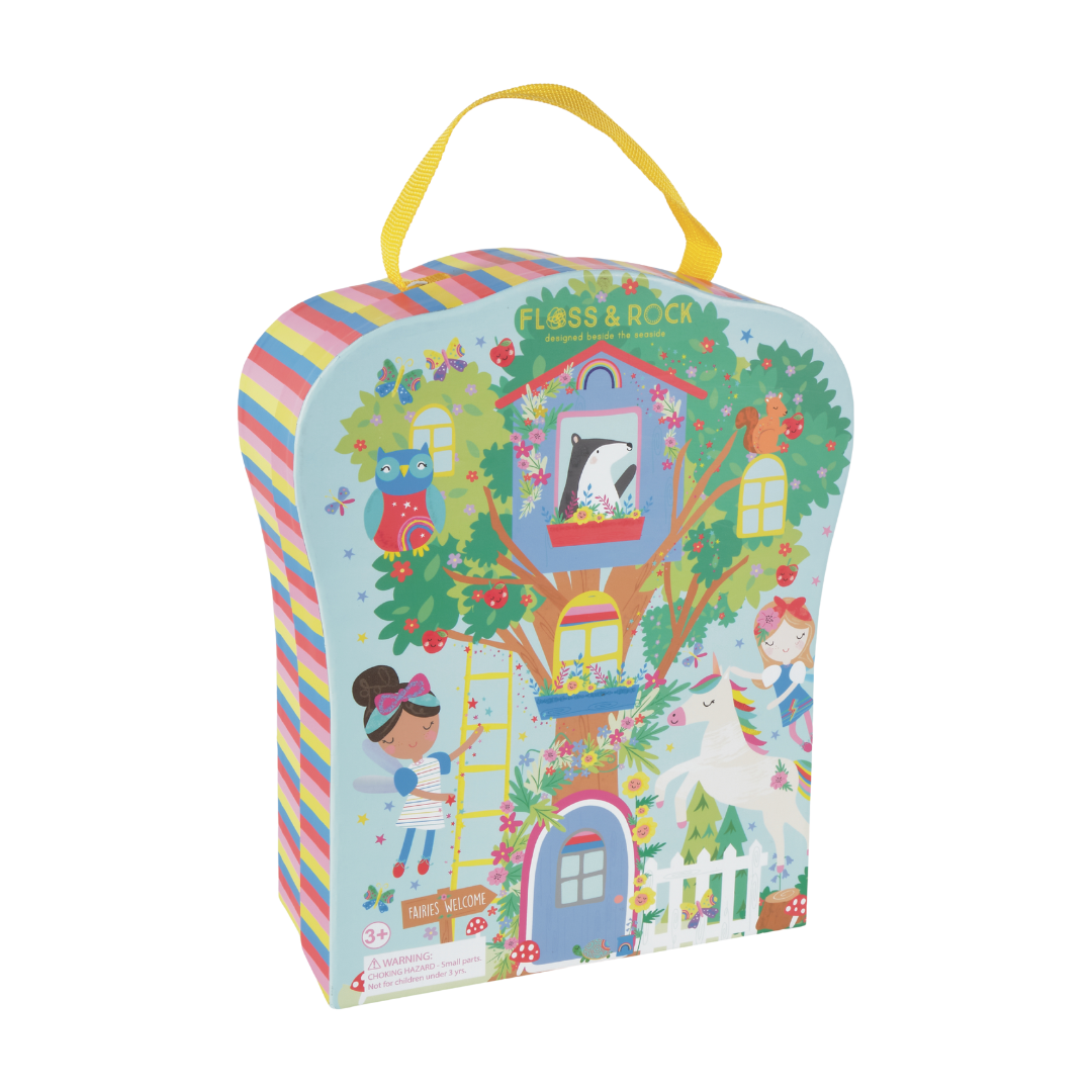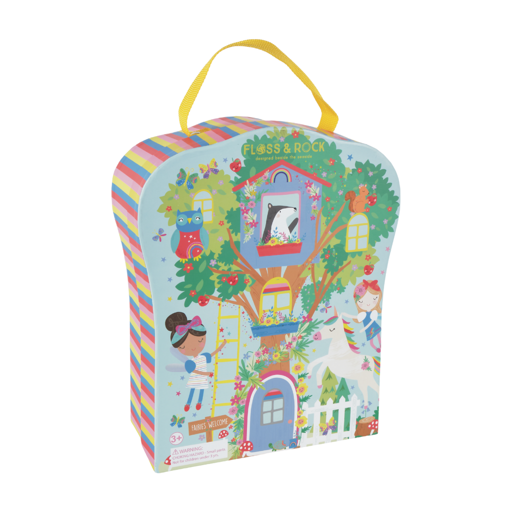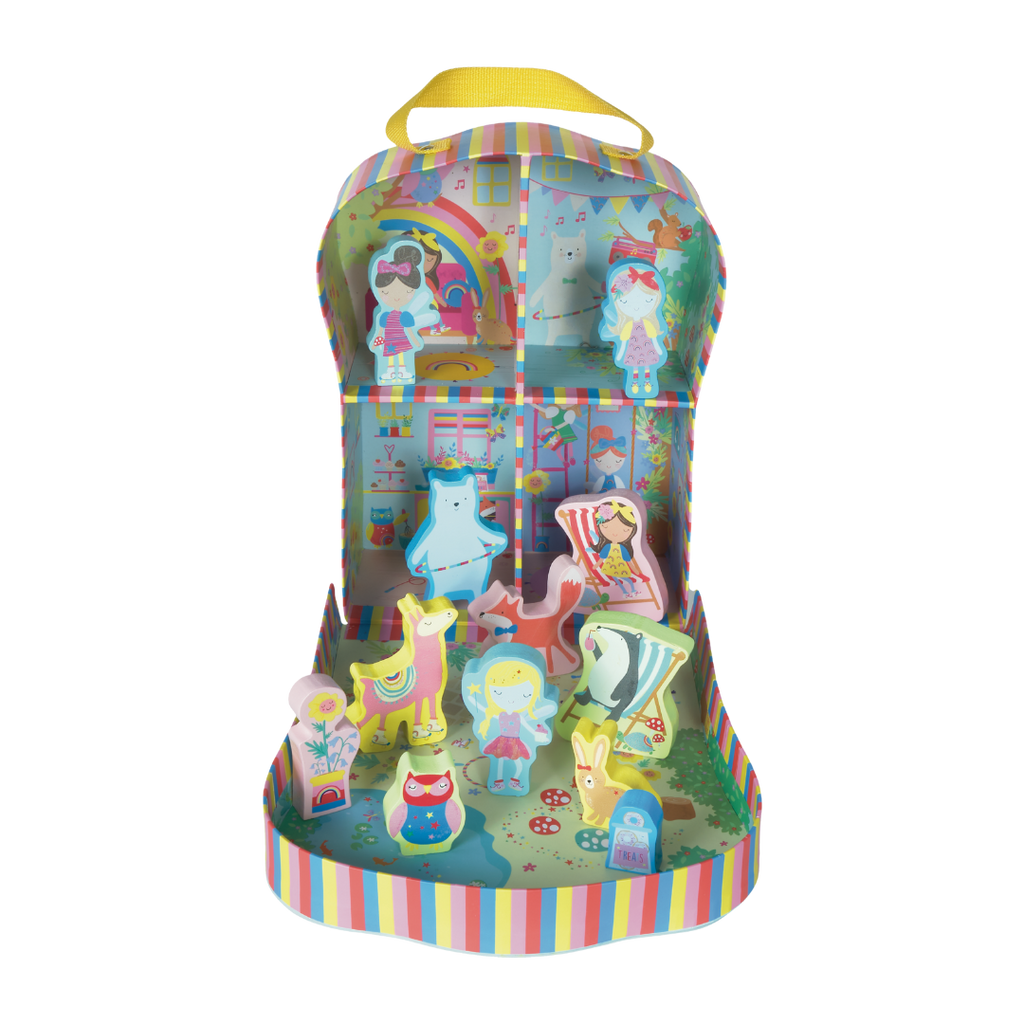 Our bright and beautiful Rainbow Fairy Playbox is perfect for on-the-go. This is a compact version of our extremely popular Rainbow Fairy Play House. The reusable box folds down to reveal four fun rooms and a gorgeous garden. Imaginations will run wild with 10 double sided wooden characters including fairies, unicorns, a hula hooping bear and a roller skating llama! When you’re finished playing, pop your wooden characters into the handy drawstring cotton bag, close your box and use the cool carry handle to take it off on your next adventure.