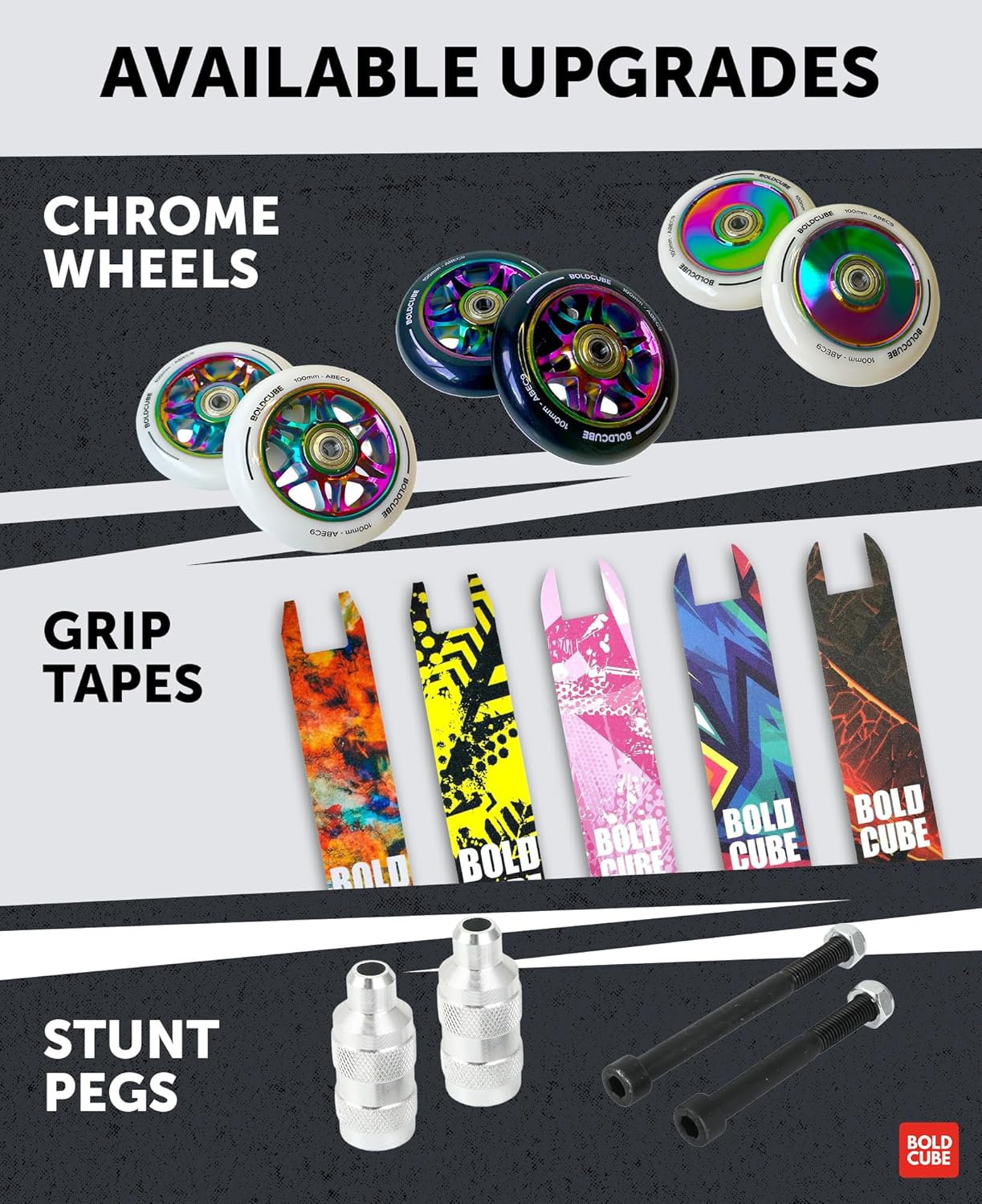 Designed for curious skate park first timers, experience a taste of the stunt scooter life without breaking the bank. Our Deluxe Stunt Scooter offers full 360 rotation, with a high volume micro crystallised gripped deck in a variety of stand out styles. The Skatepark is your oyster with this cool, hard wearing scooter that features a lightweight aluminium deck for easy deck spins with a tough steel handlebar. Material where it matters, ideal for a budding trickster that’s looking to nail their first trick. The Deluxe Stunt Scooter is fitted with more premium components for a slick entry into scooting.